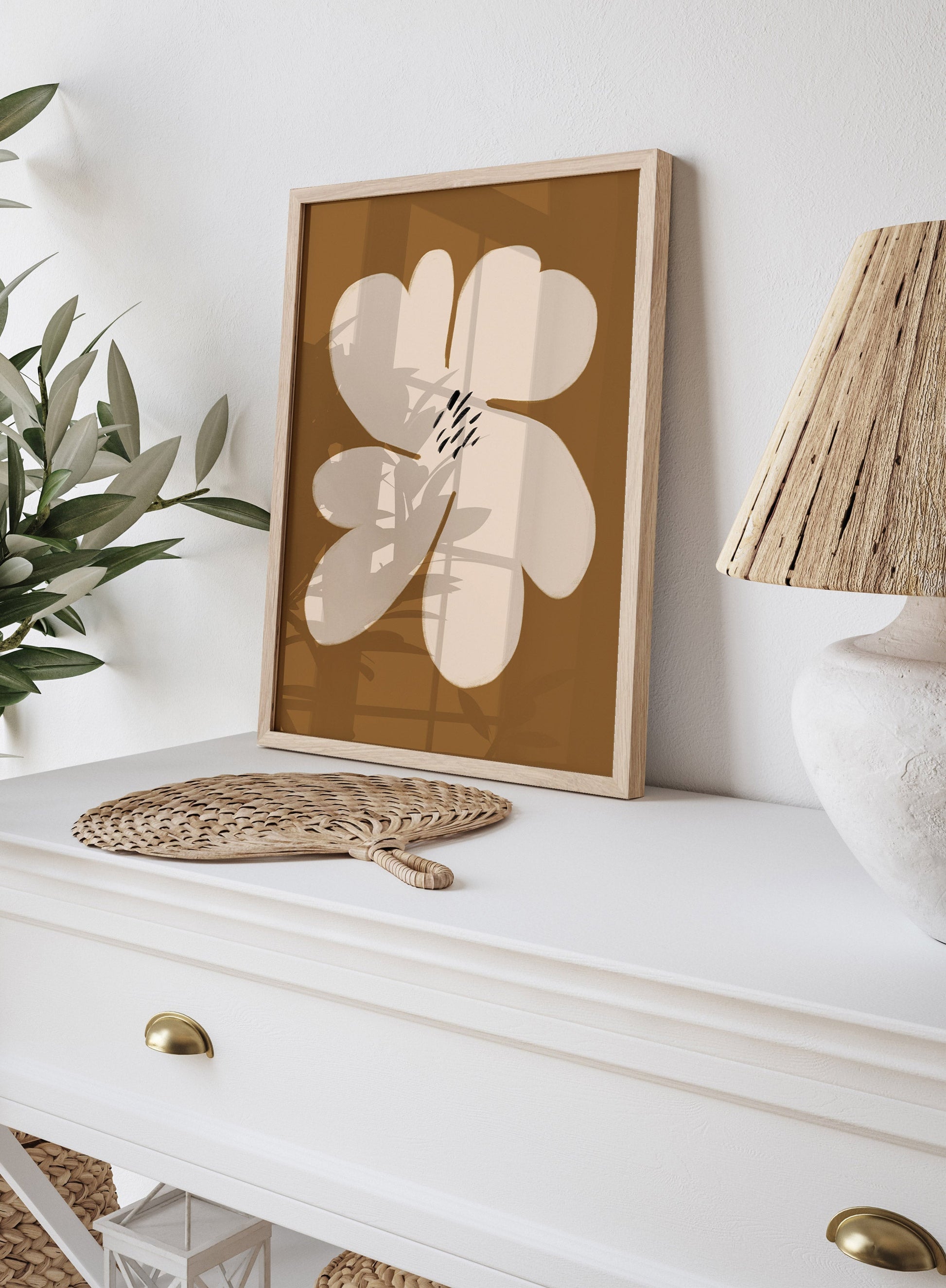 Calling all abstract floral art lovers! The ‘Flora’ poster features a stunning beige flower with minimalistic black pistils over a rich brown background. Count on this print’s color palette to add warmth and style to your walls.